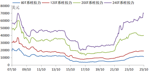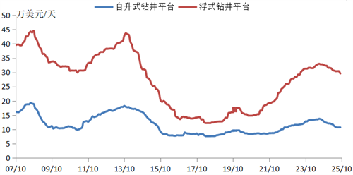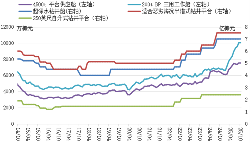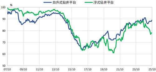全球鉆井平臺(tái)利用率和日租金小幅回落。2024年年中以來,受油價(jià)走低影響,市場(chǎng)有所回落,但仍保持在歷史高位。自升式鉆井平臺(tái)方面,截至10月底,利用率和日租金分別為89%和10.6萬美元/天,分別較2024年年中高點(diǎn)下跌2個(gè)百分點(diǎn)和21.9%。主要由于2024年初以來沙特阿美暫停了約37座自升式鉆井平臺(tái)租約,全球市場(chǎng)供給增加,船東進(jìn)行再布置時(shí)傾向于以較低的日租金費(fèi)率保證長(zhǎng)期租約。浮式鉆井平臺(tái)方面,截至10月底,利用率和日租金分別為78%和29.6萬美元/天,分別較2024年年中高點(diǎn)下跌10個(gè)百分點(diǎn)和10.4%。主要由于美國(guó)墨西哥灣地區(qū)受油價(jià)下滑影響勘探活動(dòng)減緩租約減少,英國(guó)北海地區(qū)則受政府暫停新頒海上鉆井許可政策影響鉆井活動(dòng)持續(xù)受限。