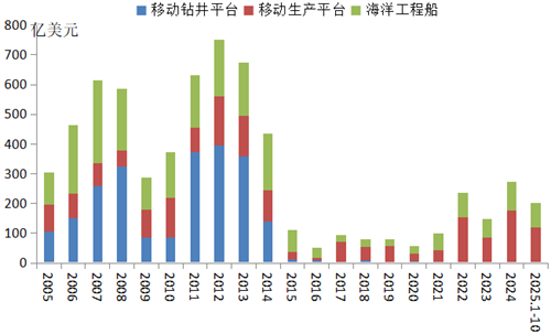 近5年來,隨著運(yùn)營(yíng)市場(chǎng)的復(fù)蘇,海工裝備新建需求明顯增加。2020-2024年,海工裝備新建訂單年均金額達(dá)到162億美元,是2015-2019年均值的兩倍。2025年1-10月,全球共成交各類海洋工程裝備140艘/座、201.5億美元,以金額計(jì)同比減少16.3%,但仍好于過去十年平均水平。