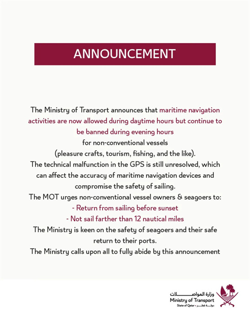 然而,影響GPS系統(tǒng)的技術(shù)故障仍未解決,當(dāng)局警告導(dǎo)航精度持續(xù)受限。根據(jù)最新指令,卡塔爾交通部對(duì)休閑船只實(shí)施嚴(yán)格管控,要求其必須在日落前返港,且活動(dòng)范圍不得超過(guò)海岸線12海里。