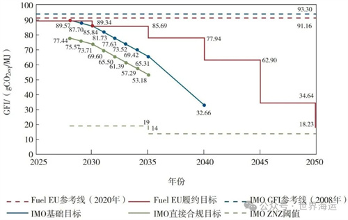 ( 2 ) 凈零框架與Fuel EU都是基于船舶年度GFI來(lái)設(shè)定履約基線的,但是計(jì)算公式、參數(shù)選擇、基準(zhǔn)值都有所不同,各年的合規(guī)基礎(chǔ)目標(biāo)也不一樣,如圖2所示,從中可看出凈零框架的履約標(biāo)準(zhǔn)嚴(yán)于Fuel EU。