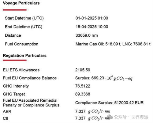 ( 3 ) EU ETS早在2005年就開始了第一階段的實(shí)施,從2024年起將航運(yùn)業(yè)納入[2-3]。船舶只要經(jīng)營(yíng)歐盟航次,其排放就必須通過(guò)EUA清繳,無(wú)論其航次GFI按照Fuel EU規(guī)定是罰款還是獲得盈余。圖3是某輪一個(gè)歐盟航次的排放報(bào)告部分截屏,可清楚看出:該航次需要繳納的EUA為2 105.59個(gè),但由于使用的LNG燃料GFI低于目標(biāo)值,產(chǎn)生的Fuel EU合規(guī)盈余高達(dá)51.2萬(wàn)歐元。
