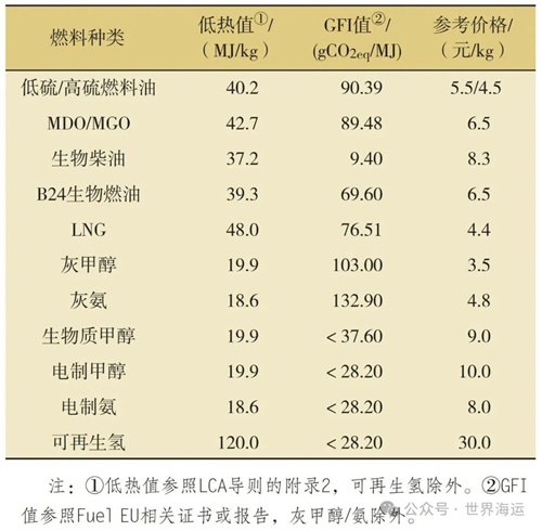 凈零框架實(shí)施后,航運(yùn)公司燃料選項(xiàng)增多,測(cè)算總成本時(shí)需要權(quán)衡多種因素包括燃料的市場(chǎng)價(jià)格、消耗量 ( 與熱值相關(guān) )、合規(guī)成本或盈余 ( 與GFI相關(guān) ) 等綜合考量。常見燃料的低熱值、GFI值和國(guó)內(nèi)市場(chǎng)參考價(jià)格見表2。