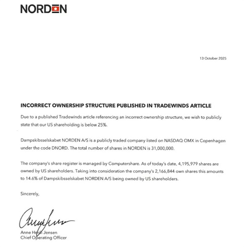 在Star Bulk之后,丹麥老牌航運(yùn)集團(tuán)NORDEN也作出回應(yīng)。公司在提交給投資者的說(shuō)明中指出,此前TradeWinds報(bào)道美國(guó)投資者持有其超過(guò)80%股份有誤,公司在哥本哈根納斯達(dá)克OMX交易所上市,股票代碼為“DNORD”,截至最新統(tǒng)計(jì),美國(guó)股東僅持有約419.6萬(wàn)股,占總股本的 14.6%。