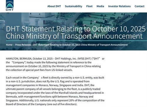 在油輪領(lǐng)域,總部位于百慕大的 DHT Holdings, Inc. 亦發(fā)布官方聲明,明確指出公司船隊(duì)不在被納入“特別港務(wù)費(fèi)”征收范圍。