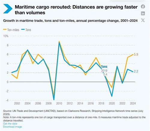 在去年實(shí)現(xiàn)強(qiáng)勁增長(zhǎng)后,海運(yùn)貿(mào)易于2025年陷入停滯,運(yùn)量?jī)H增長(zhǎng)0.5%。地緣政治緊張迫使長(zhǎng)途航線調(diào)整,去年以噸海里計(jì)的運(yùn)輸量因此大幅攀升,增長(zhǎng)率接近6%。