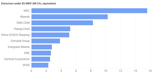 該數(shù)據(jù)源自歐盟MRV體系(監(jiān)測、報告與核查體系,旨在對進(jìn)入或離開歐洲領(lǐng)海的商船所產(chǎn)生的二氧化碳排放進(jìn)行系統(tǒng)的監(jiān)測、報告與核證),其統(tǒng)計對象為?繗W洲港口、總噸位5000噸及以上的船舶。數(shù)據(jù)顯示,在污染企業(yè)排名中,地中海航運(yùn)公司(MSC)是歐盟航運(yùn)領(lǐng)域最大污染者,二氧化碳排放量達(dá)1560萬噸,格里馬爾迪集團(tuán)是非集裝箱航運(yùn)領(lǐng)域的最大排放方,排放量達(dá)380萬噸,嘉年華則是郵輪行業(yè)排放最高的企業(yè),排放量達(dá)250萬噸。