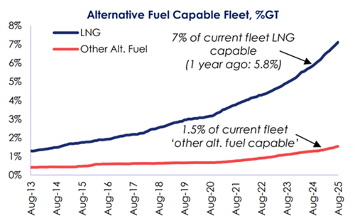 根據(jù)克拉克森的數(shù)據(jù),整體而言按噸位計(jì)算,截至目前在運(yùn)營船隊(duì)中能夠使用替代燃料或推進(jìn)裝置船舶的比例已經(jīng)提高到了8.6%,高于2017年的2.6%和2024年年初的6.5%。在現(xiàn)有總計(jì)2509艘替代燃料船舶中,包括1449艘LNG動力船、72艘甲醇動力船、143艘LPG動力船、732艘電池/混合動力推進(jìn)船,此外還有268艘采用其他燃料。