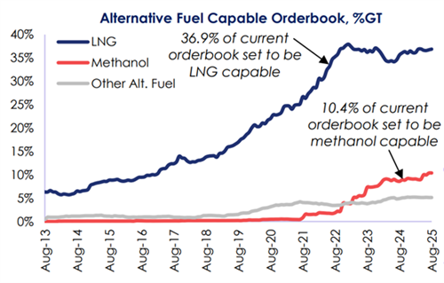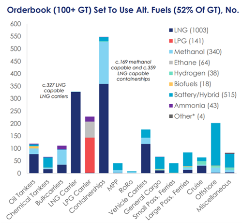 今年的替代燃料船舶訂單包括LNG動力船129艘1840萬總噸,甲醇動力船53艘610萬總噸,LPG動力船14艘60萬總噸,乙烷動力船4艘10萬總噸,以及電池/混合動力推進(jìn)船舶86艘120萬總噸。