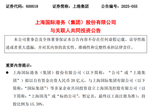 11月13日,上海國際港務(集團)股份有限公司(證券代碼:600018,證券簡稱:上港集團)發(fā)布公告,擬以自有資金出資人民幣 20 億元,與上海國際集團有限公司(以下簡稱:“國際集團”)等多家企業(yè)共同投資設立上海國茂控股有限公司(以下簡稱,“上海國茂”),持股比例為 15.38%。