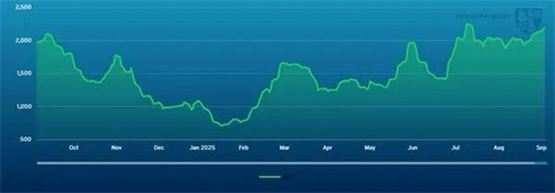 自8月初以來,我們看到FBX01(中國/東亞–美國西岸)從8月初的高點2,369美元降至8月底的低點1,728美元,并在整個9月維持在2,000美元低位區(qū)間,今日報2,295美元。FBX03(中國/東亞–美國東岸)在同期也呈現(xiàn)類似走勢,8月初運價為3,705美元,今日為3,630美元,8月底曾跌至2,703美元的低點。
