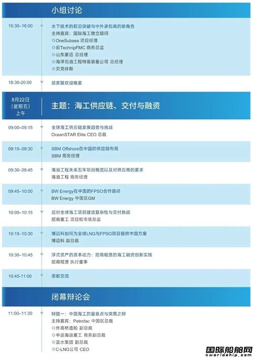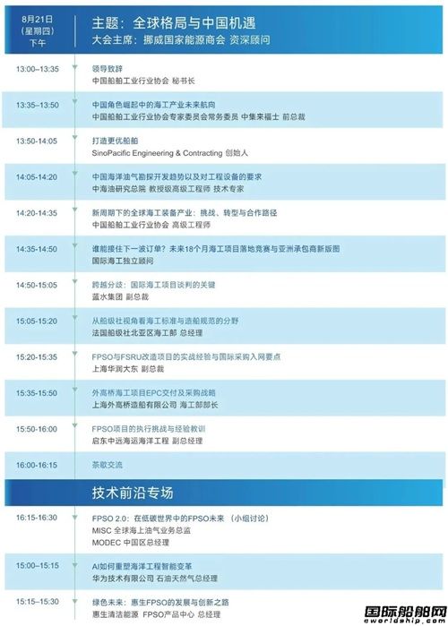 峰會嘉賓陣容涵蓋全球頂尖油氣公司、海洋工程總包商、海工船廠及關(guān)鍵系統(tǒng)供應(yīng)商的高層代表與技術(shù)權(quán)威。中國船舶工業(yè)行業(yè)協(xié)會秘書長將致開幕辭,中集來福士前總裁、中海油研究總院技術(shù)專家、法國船級社北亞區(qū)海工部總經(jīng)理等業(yè)內(nèi)大咖,將圍繞 “中國角色崛起中的海工產(chǎn)業(yè)未來航向”“全球海工裝備產(chǎn)業(yè)挑戰(zhàn)與轉(zhuǎn)型”“海工標(biāo)準(zhǔn)與造船規(guī)范分野” 等核心議題展開深度分享。